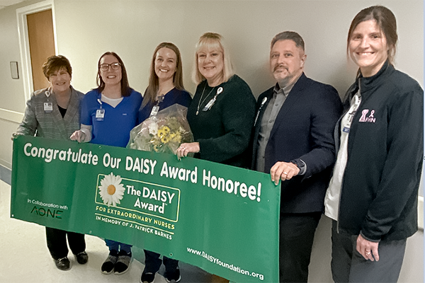 Pictured left to right: Ambulatory Care Team Leader Brandy Quinn, President and CEO Mark Gridley, DAISY winner Courtney Dodds, Med/Surg Nursing Operations Leader Tabitha Graves, and Vice President, COO/CNO Kathy Martinez.
